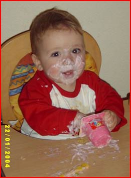 Nu ik kan lopen, vind ik ook dat ik voortaan zelf mijn eten op mag eten, zonder hulp van papa en mama. Daar zijn papa en mama het nog niet zo mee eens. Als ik zelf mijn bordje leeg heb gegeten, moet mama daarna mijn hele stoel, kleren en vloer schoonmaken. Maar ik vind het wel erg stoer om alles op de grond te gooien als ik klaar ben. Valerie moet er tenminste altijd erg om lachen.