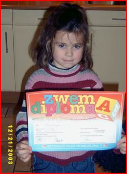20 december was het dan eindelijk zover. Ik moest zwemmen voor diploma A. Dit was wel erg spannend. Er waren heel veel kindjes en we moesten eerst even zwemmen met de kleren aan. Het was in een ander zwembad dan waar ik normaal altijd moet zwemmen. Dit zwembad was veel groter en het water was ook veel kouder. Maar het ging heel erg goed. Na het zwemmen moesten we nog heel lang wachten tot de diploma uitreiking, dus gingen we even eten bij Mc Donalds. Daarna kreeg ik mijn diploma A. Nu ga ik ook nog verder met zwemmen voor diploma B. Maar ik kan nu wel al helemaal alleen zwemmen. |